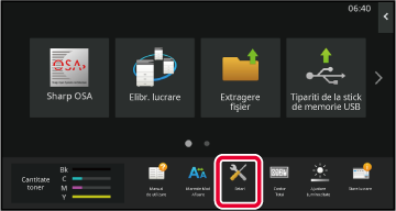 "Setări" permite gestionarea diferitelor funcții pentru a asigura manevrarea confortabilă a echipamentului, precum înregistrarea implicită pentru fiecare funcție, setări conectare rețea, verificarea jurnalului de stări ale activităților.