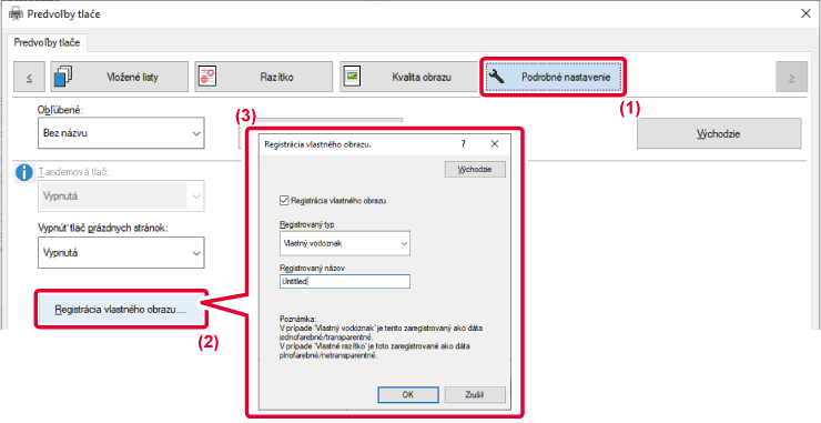 Táto funkcia registruje obrázky použité ako vlastné obrázky z ovládača tlačiarne zariadenia.