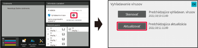 Keď sa zistí vírus v súvislosti so vstupnými údajmi, na dotykovom paneli sa zobrazí hlásenie o zistení vírusu, vstupné údaje alebo vstupná úloha budú zrušené a údaje alebo údaje úlohy, ktoré mali byť výstupom, budú vyradené. Údaje v zdroji vstupných údajov (pamäť USB, externý server a pod.) nebudú odstránené. Keď sa zistí vírus v súvislosti s výstupnými údajmi, na dotykovom paneli sa zobrazí hlásenie o zistení vírusu, výstupné údaje alebo výstupná úloha budú zrušené a výstupné údaje alebo údaje úlohy budú odstránené. V oblasti "Upozornenie" na obrazovke Informácie o systéme sa zobrazí hlásenie o zistení vírusu. |