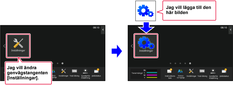 Inställningarna lagras i maskinen och aktiveras.Det här avsnittet beskriver hur du ändrar en snabbknapp på startskärmen.