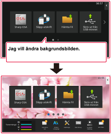 Tryck på [System inställningar] → [Hemskärms inställning] → [Bakgrundsbild] och därefter på knappen [Ändra].