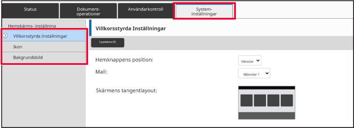 När fabriksinställningarna är aktiva måste du ange ditt användarlösenord efter det att du angett IP-adressen.Klicka på fliken [Systeminställningar] →[Hemskärms inställning]→ [Hemknappens position] på webbsidan.