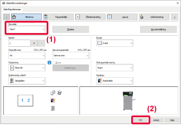 Inställningar kan sparas via flikarna i skrivardrivrutinens egenskapsfönster. De konfigurerade
