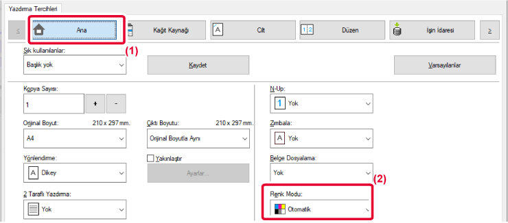 "Renk Modu" (yazdırma için kullanılan bir renk takımı) için, aşağıdaki üç seçenek