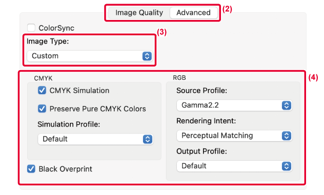 Renk yönetim ayarlarını yapmak için menülerden istenen ayarları seçin. Bir "CMYK Simulation" ayarı seçmek için, "Image Type" bölümünde [Custom] seçin, [CMYK Simulation] onay kutusunu (
