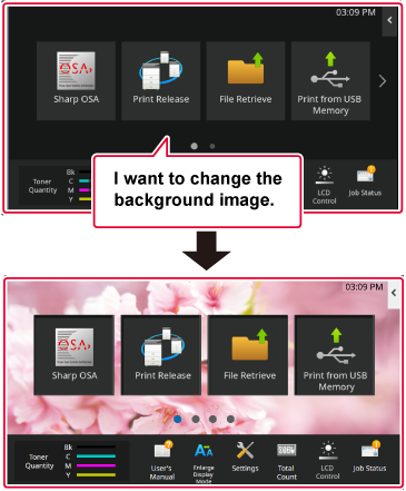 Tap [System Settings] → [Home Screen Settings] → [Background Image], and then tap [Change] key.