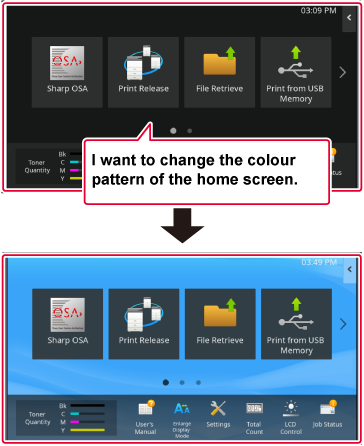 The settings are saved in the machine and applied.Multiple home screen layout patterns are preset in the machine. These include a layout