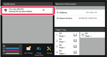 When a virus is detected with respect to the input data, the touch panel will display that a virus has been detected, the input data or the job to be input will be canceled, and the data or job data that was about to be output will be discarded. Data in the data input source (USB memory, external server, etc.) will not be deleted. When a virus is detected with the output data, the touch panel will display that a virus has been detected, the output data or the job to be output will be canceled, and the output data or job data will be deleted. The virus detection message will be displayed in the "Notification" of the System Information screen. |