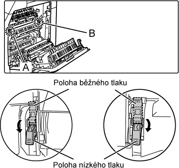 Fixační jednotka má vysokou teplotu. Při používání páček pro regulaci tlaku fixační jednotky dávejte pozor, abyste se nepopálili.Upozornění
