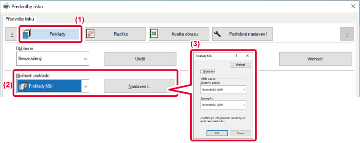 - Vyberte možnost [Proklady fólií] a klikněte na tlačítko [Nastavení].
