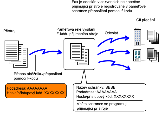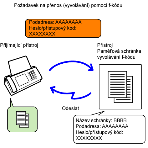 f-kód (podadresa a heslo/přístupový kód) je připojen k faxovému