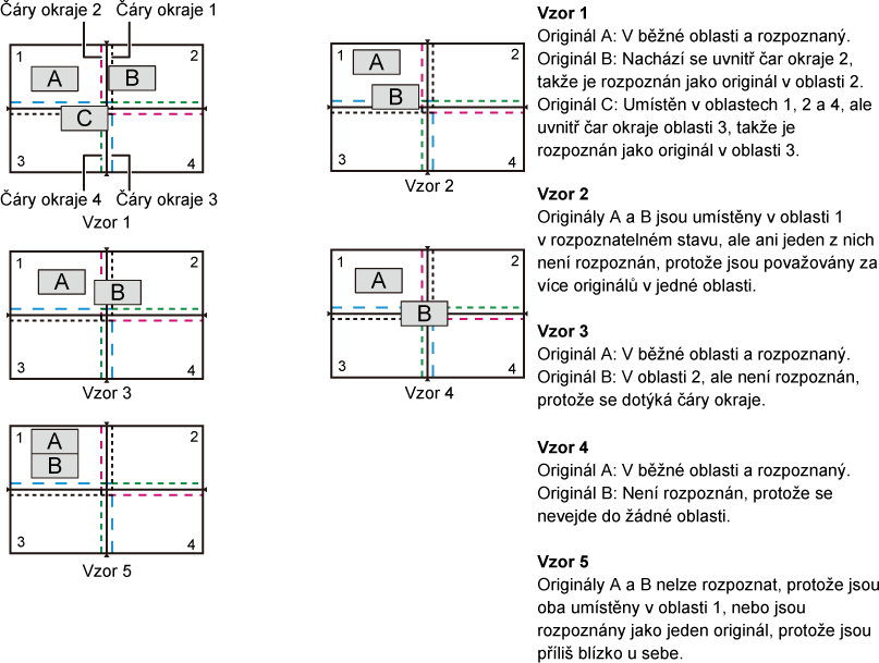 Jestliže budete skenovat originály při zavřeném automatickém podavači dokumentů, nebude možné detekovat vnější okraje originálů a skenování se nepodaří. Tuto funkci vždy používejte pouze s otevřeným automatickým podavačem dokumentů. Jestliže na originály během skenování září nějaký zdroj světla, nemusí být oříznutí provedeno úspěšně. Upravte úhel automatického podavače dokumentů tak, aby zdroj světla neměl vliv na obraz.Upozornění