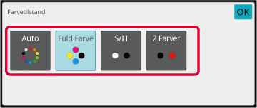Når indstillingerne er angivet, skal du trykke på tasten [OK] på skærmen [2 Farver] og kontrollere, at den ændrede indstilling vises ved siden af tasten [2 Farver] på farvetilstandskærmen.Originalen kopieres i en enkelt farve.