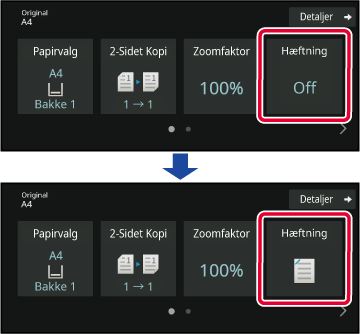 Aktiverer sorteringsfunktionen, når originalen lægges i den automatiske dokumentfeeder, og aktiverer gruppefunktionen, når originalen placeres på glaspladen. |