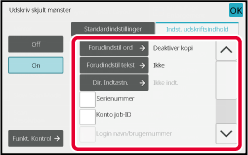 Når du vil angive udskriftsindstillinger, kan du vælge den ønskede indstilling ud fra en forindstillet tekst eller bruge softwaretastaturet. Du kan også udskrive serienummer og job-id for konto.