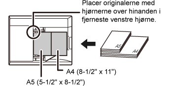 Der vises en markering på ikonet.Læg originalen med tekstsiden opad i dokument-feederen med hjørnerne tilpasset efter dokumentfeederens fjerneste venstre hjørne.