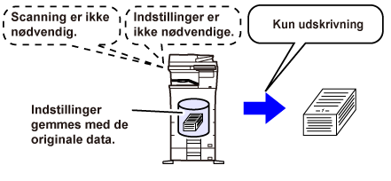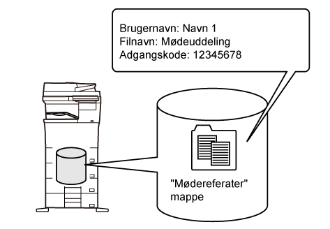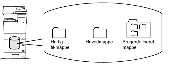 Når et kopierings-, billedafsendelses- eller andet job udføres, gemmer denne funktion dokumentdataene på det lokale drev. Anvend denne funktion, når du hurtigt og nemt vil gemme dokumentdata uden at specificere et filnavn eller anden information. Den gemte fil kan også anvendes af andre personer. Brug ikke denne metode til at gemme filer, som du ikke vil have andre skal bruge. |