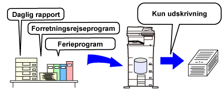 Når et kopierings-, billedafsendelses- eller andet job udføres, gemmer denne funktion dokumentdataene på det lokale drev. I modsætning til Hurtig Fil kan mange typer af information tilføjes filen, når den gemmes for at aktivere effektiv filbehandling. Der kan også oprettes en adgangskode. |