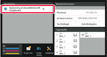 Når der registreres en virus i forbindelse med inputdata, vises det på berøringspanelet, at der er registreret en virus, inputdataene eller det job, der skal indlæses, annulleres, og de data eller jobdata, der skulle udskrives, kasseres. Data i datainputkilden (USB-hukommelse, ekstern server osv.) bliver ikke slettet. Når der registreres en virus i forbindelse med outputdataene, vises det på berøringspanelet, at der er registreret en virus, outputdataene eller det job, der skal udskrives, annulleres, og outputdataene eller jobdataene slettes. Meddelelsen om virusdetektion bliver vist i "Besked" på skærmen Systeminformation. |