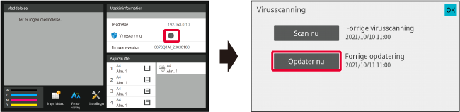 ved at vælge [Udfør opdatering nu] i [Virusscanningsindstilling] i systemindstillingerne.