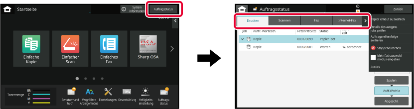 berühren, wird der Auftragsstatusbildschirm angezeigt. Berühren