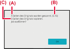 Im Bestätigungsbildschirm wird die Anzahl der gescannten Originalblätter wird in (A), die Anzahl der gescannten Seiten in (B), und die Anzahl der zu sendenden Blätter mit Ausnahme der leeren Seiten in (C) angezeigt.