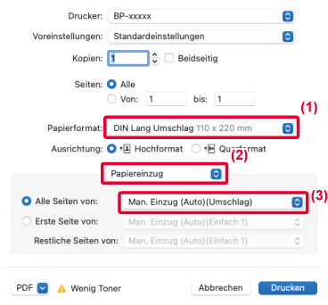 - Wählen Sie im Menü "Papiergröße" das Umschlagformat