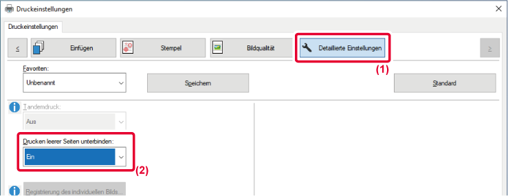 2. Wählen Sie unter [Drucken leerer Seiten unterbinden] die Option [Ein] aus.