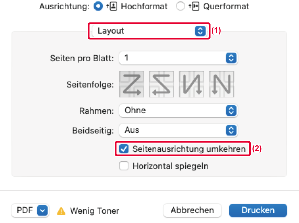 Druckbilds um 180 Grad, sodass es korrekt auf Papier gedruckt werden kann,