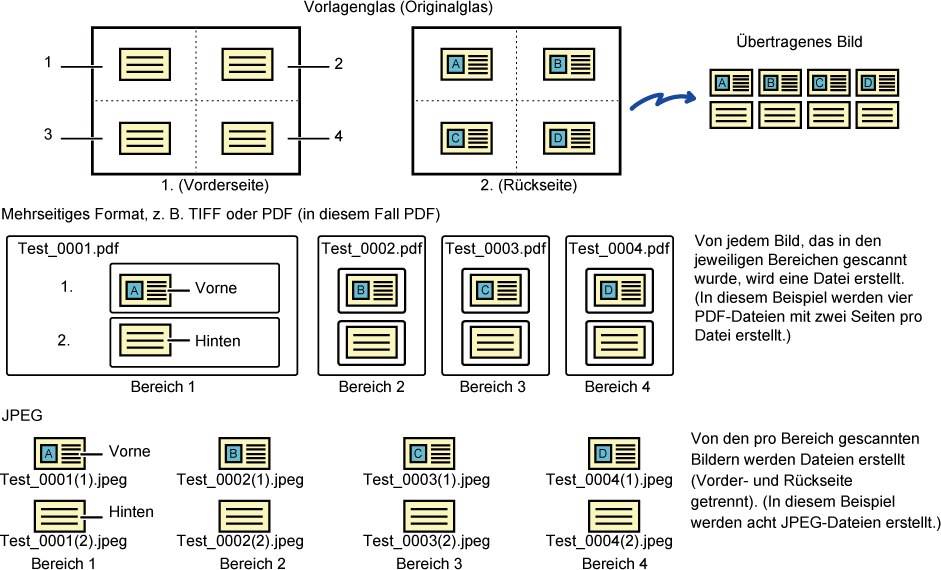 dem Vorlagenglas platziert werden, als separate Dateien gescannt.