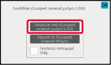 Όταν εμφανιστεί η οθόνη για την επιλογή ενέργειας, πατήστε [Εκτύπωση από εξωτερική συσκευή μνήμης (USB)].