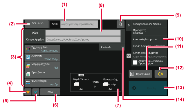 Σε αυτή την ενότητα περιγράφονται τα πλήκτρα σε μια βασική οθόνη, λαμβάνοντας ως παράδειγμα τη βασική οθόνη E-mail. Διατίθενται διάφορες μέθοδοι στη λειτουργία Αποστολής Εικόνας, συμπεριλαμβανομένων της Σάρωσης σε E-mail και της Σάρωσης σε FTP. Η διάταξη της βασικής οθόνης παρουσιάζει μικρές διαφορές, ανάλογα με τον τρόπο αποστολής της εικόνας.