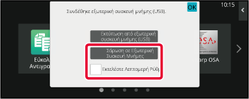 Όταν εμφανιστεί η οθόνη επιλογής ενέργειας, πατήστε [Σάρωση σε Εξωτερική Συσκευή Μνήμης].