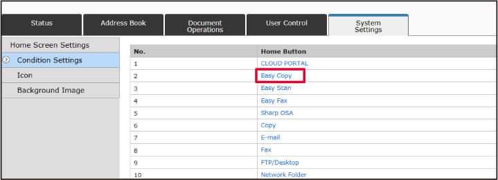 In the factory default state, you must enter your user password after entering the IP address.On the Web page, click the [System Settings] tab → [Home Screen Settings] → [Home Button Position].