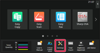 When the USB device is connected to the machine, the popup window will be appeared. Tap the [OK] key.Tap the [Settings] key on the Home screen.