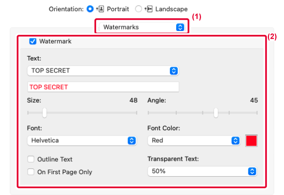 2. In macOS 13 and macOS 14, [Watermarks] is located under the "Printer Options" menu.