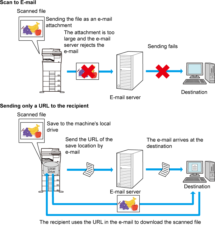 This function saves the scanned file on the machine's local drive, and sends an e-mail providing only the file's URL information to the recipient.