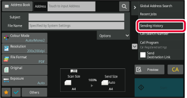 In the base screen or address book screen, tap [Sending History] on the action panel.