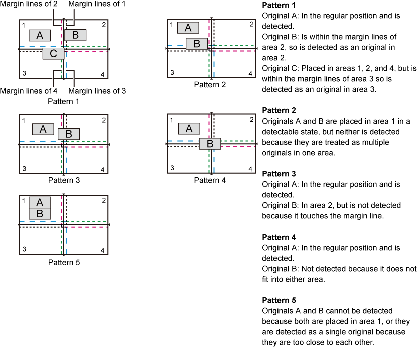 If you scan the originals with the auto document feeder closed, it will not be possible to detect the outlines of the originals and scanning will fail. Always use this function with the auto document feeder open. If a light source such as an electric light shines onto the originals during scanning, cropping may not be successful. Adjust the angle of the automatic document feeder so that the light source does not affect the image.Caution