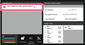 When a virus is detected with respect to the input data, the touch panel will display that a virus has been detected, the input data or the job to be input will be cancelled, and the data or job data that was about to be output will be discarded. Data in the data input source (USB memory, external server, etc.) will not be deleted. When a virus is detected with the output data, the touch panel will display that a virus has been detected, the output data or the job to be output will be cancelled, and the output data or job data will be deleted. The virus detection message will be displayed in the "Notification" of the System Information screen. |