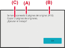 En la pantalla de confirmación, el número de hojas originales escaneadas aparece en (A), el número de caras escaneadas aparece en (B) y el número de copias, excluidas las páginas en blanco, aparece en (C).