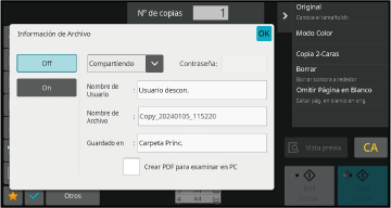 Coloque el documento original en la bandeja del alimentador de documentos automático o sobre el cristal de exposición.Cambie a modo normal y pulse [Archivo] en el panel de acciones para especificar la información del archivo.