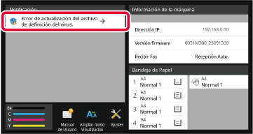 La actualización se cancelará y en el panel táctil se indicará que el archivo actualizado está dañado. Una vez que el usuario confirme el contenido y cierre la pantalla, la máquina funcionará con el firmware anterior a la actualización. Si el firmware se había actualizado de forma remota, la actualización se cancelará y la información sobre la detección del virus se mostrará en la "Notificación" de la pantalla de información del sistema. La máquina funcionará con el firmware anterior a la actualización. |