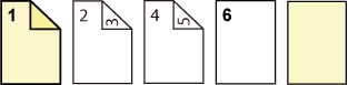 ![]() Lisää etukannen kopioiden alkuun ja tekee alkuperäisen 6. sivusta takakannen yksipuolisena kopiona. Alkuperäisen 5. sivusta tehdään yksipuolinen kopio. |
