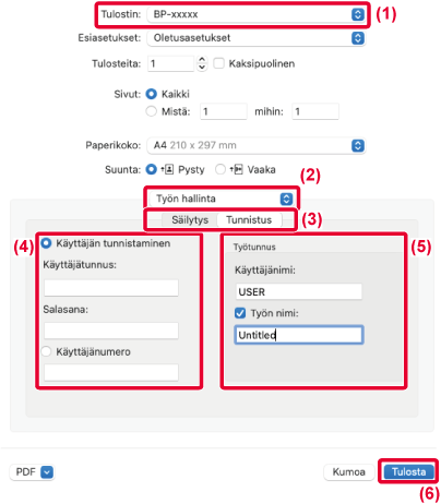 - Syötä tarvittaessa käyttäjänimi ja työn nimi.