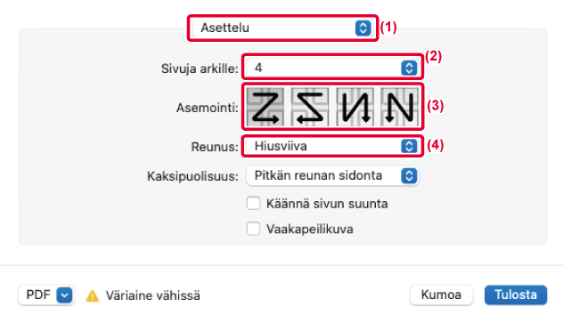 [4 otosta] (4 sivua arkilla), saavutetaan seuraavat tulostuksen tulokset