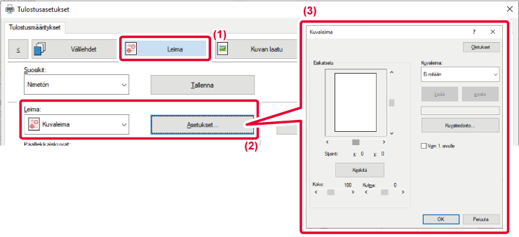 - Valitse [Vesileima] kohdasta "Leima" ja napsauta [Asetukset]-painiketta.