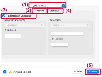MacOS 13:ssa ja macOS 14:ssa, [Työn hallinta] löytyy ”Tulostinvaihtoehdot”-valikosta.
