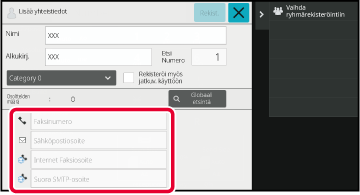 Kosketa [Faksinumero], [Sähköpostiosoite], [Internet Faksiosoite] tai [Suora SMTP-osoite] syöttääksesi osoitteen ja kosketa sitten .
