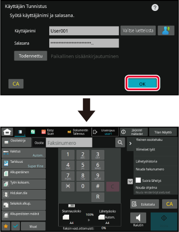 Jos annettu käyttäjänimi ja salasana tunnistetaan, käyttäjän skannattavien tai kopioitavien jäljellä olevien sivujen lukumäärä näytetään.